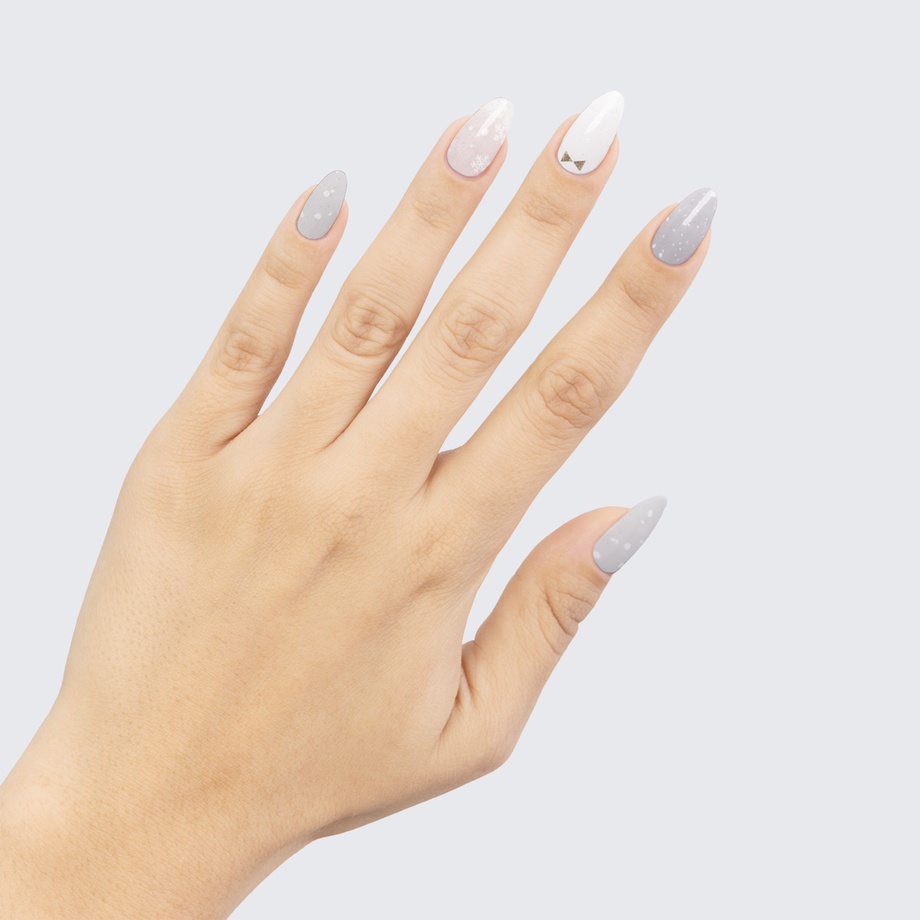 Translucent base. White snowflake detailing with white & silver polka dots. Neutral undertone.